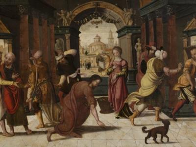 نحن في الهيكل، حيث جاء يسوع من جبل الزيتون؛ جلس وبدأ يُعلّم الشعب المجتمع حوله (يوحنا 8 :1-2). وبينما كان يُعلّم، جاء إليه الكتبة والفريسيون يقودون امرأة زانية، وطلبوا منه أن يحكم عليها. لكن يسوع سكت، وخطّ بإصبعه على الأرض (يوحنا 8 :6). ولما أصروا، نطق يسوع بالكلمات الشهيرة: "من منكم بلا خطيئة، فليرجمها بحجر" (يوحنا 8 :7)، ثم انحنى مرة أخرى، وأخذ يخطّ مجدداً على الأرض (يوحنا 8 :8).