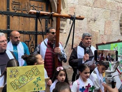 الفاتيكان - نظمت المدارس الكاثوليكية في القدس، يوم الجمعة الماضي، رتبة درب الصليب، واجتاز خلالها التلامذة أزقة المدينة العتيقة، رافعين لافتات كُتبت عليها صلوات من أجل جميع المرضى وبنوع خاص من أجل البابا فرنسيس الذي يتلقى العلاج في المستشفى منذ أكثر من شهر.