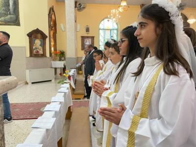 وترأس القداس النائب البطريركي العام في القدس المطران وليم الشوملي، وناول القربان المقدس للمرة الأولى لستة أطفال من الرعية، ومسحهم بزيت الميرون المقدس.