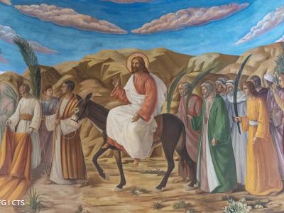 "ينكشف العهد القديم من خلال كل فعل قام به يسوع: يدخل الملك المسيح المدينة المقدسة بكل تواضع. إنه ليس ملكًا على طريقة الغيورين. إنه ليس ملكًا سياسيًا. في هذا المشهد، يُعرّف يسوع نفسه بأنه كيريوس (κύριος) عندما يطلب من التلاميذ أن يُجيبوا: "الرب يحتاج إليه"؛ لن يتضح هذا اللقب للتلاميذ إلا بعد عيد الفصح، عندما سيظهر يسوع رباً للحياة منتصراً على الموت."